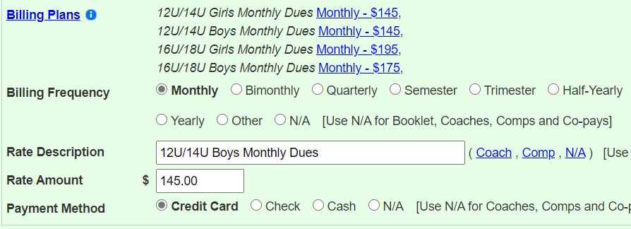 | 4 | Sophia Billy | $ 255.00 | Credit Card | Monthly | 18U Girls Monthly Dues | |