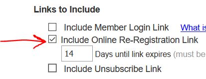 Including the "Online Re-Registration Link" will dynamically insert a unique and custom link for each member in the email they receive from you. In other words, each member's Re-Registration link is different and is coded to their own member profile.